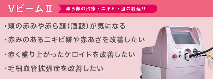 Vビームのレーザー光は、血管中のヘモグロビンに吸収されることで余剰な血管や色素を除去し、赤アザ・赤ら顔・赤く炎症したニキビ・ニキビ跡などの赤みを伴う皮膚の病変に対して、効果が期待できます。