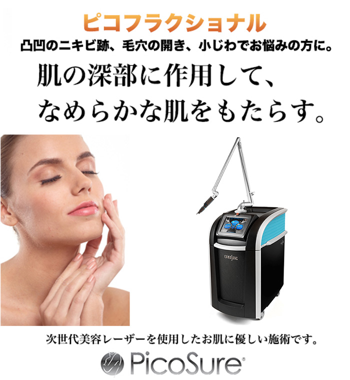 ピコシュアは肌の基底部(肌の深い部分)からリモデリングを促すため、塗り薬やピーリングでは効果が期待できなかった、表面が凸凹になってしまったニキビ跡や小じわ、毛穴の開きなどに高い効果を発揮します。また、レーザーを照射することで、メラニン色素も破砕するため、シミやソバカスの治療効果ももたらしてくれます。